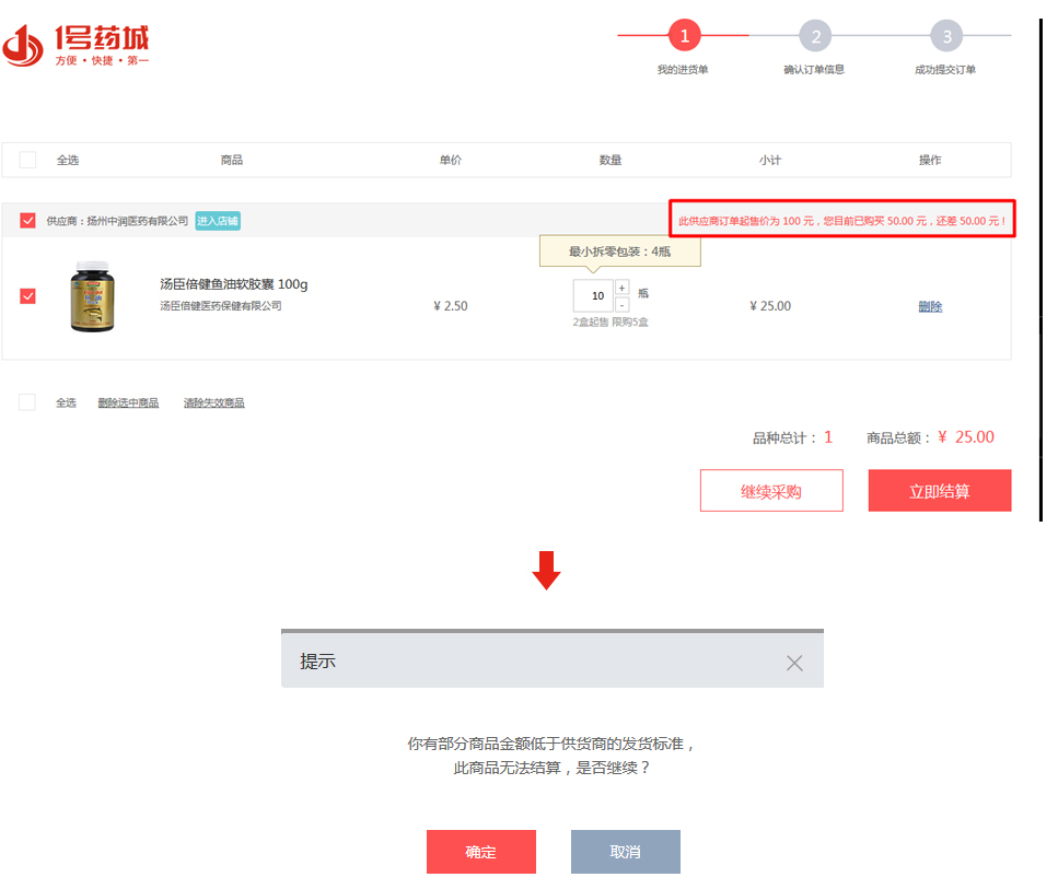 2在進貨單頁面可以看到所有加入進貨單的藥品,選擇需要購買的藥品,點擊"立即結算"進入訂單確認頁