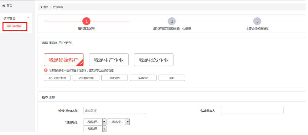 1注冊成功后,進入會員中心頁面,點擊左側“用戶資料完善”菜單;根據提示分步驟完善資料,首先填寫基礎資料