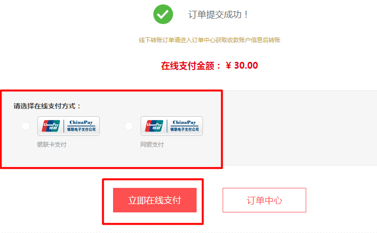 1在確認訂單信息頁面,選擇"在線支付"后,點擊“提交訂單”