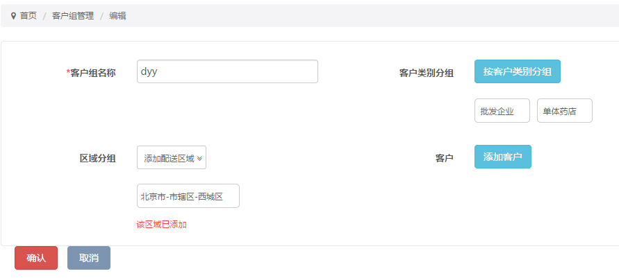 2進入“新增客戶組”頁面,制定客戶組名稱和區域,對客戶組的類別分組選擇。如果僅需單獨添加一個買家,可以點擊“添加客戶”按鈕進行添加。完成后點擊“確認”