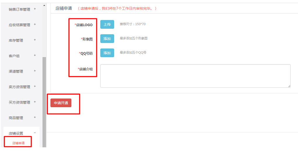 1資料認證成功的賣家進入“店鋪設置-店鋪申請”頁面,可上傳輪播圖、企業logo等資料
